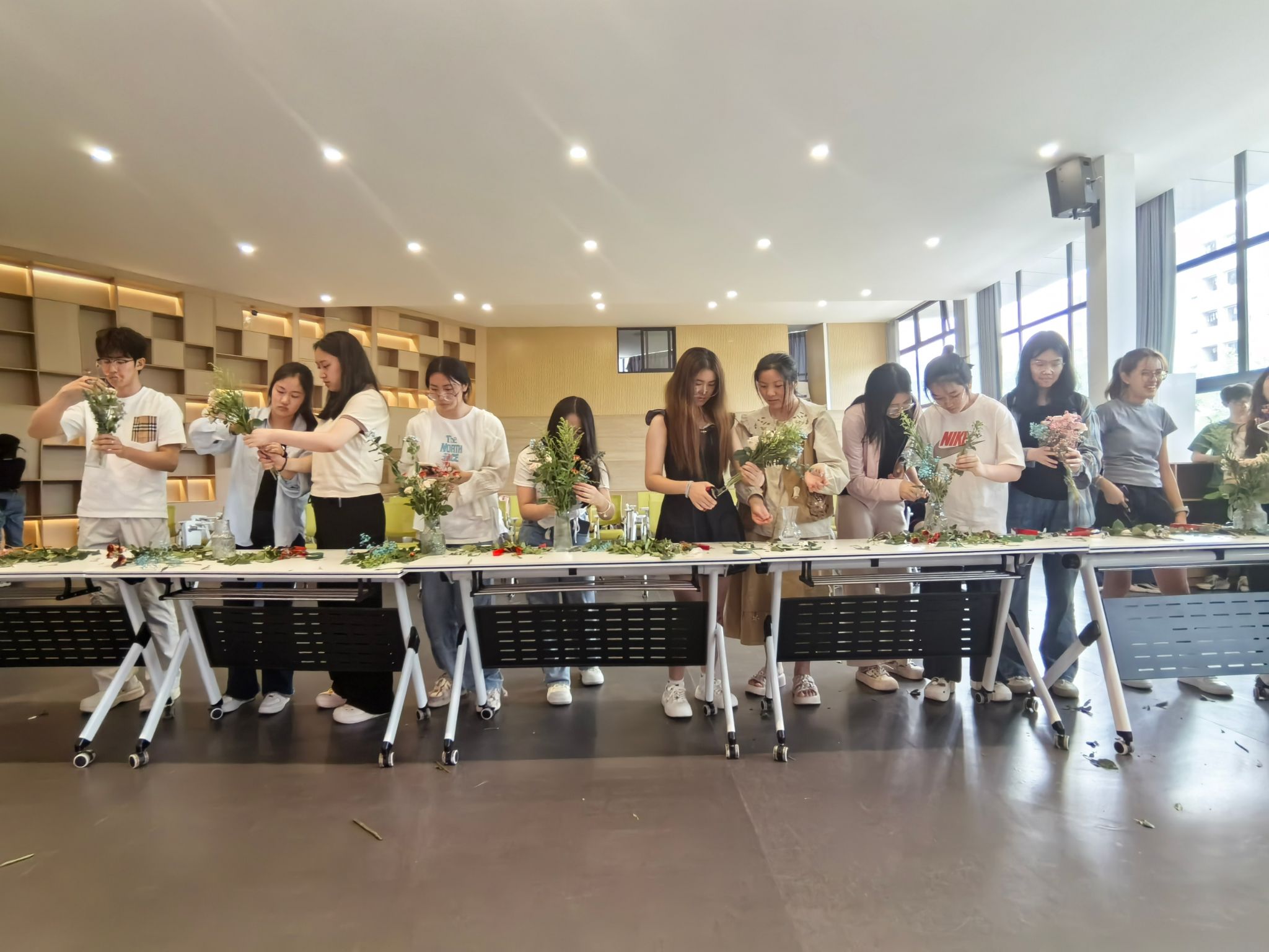 2024级风景园林硕士研究生吴佳应带领同学们走进“插花艺术课堂”。她曾将花艺带到库区小朋友的身边,以花枝为笔,为乡村振兴写下温润的旁白。参加沙龙活动的同学们纷纷走到台前,发挥自己的想象开始了“插花秀”,彼此交流心得,分享创作灵感,沉浸在亲手创作的乐趣和插花艺术带来的快乐中,现场欢声笑语。“乡村振兴”的无形语言凝为可见可感的艺术作品。
