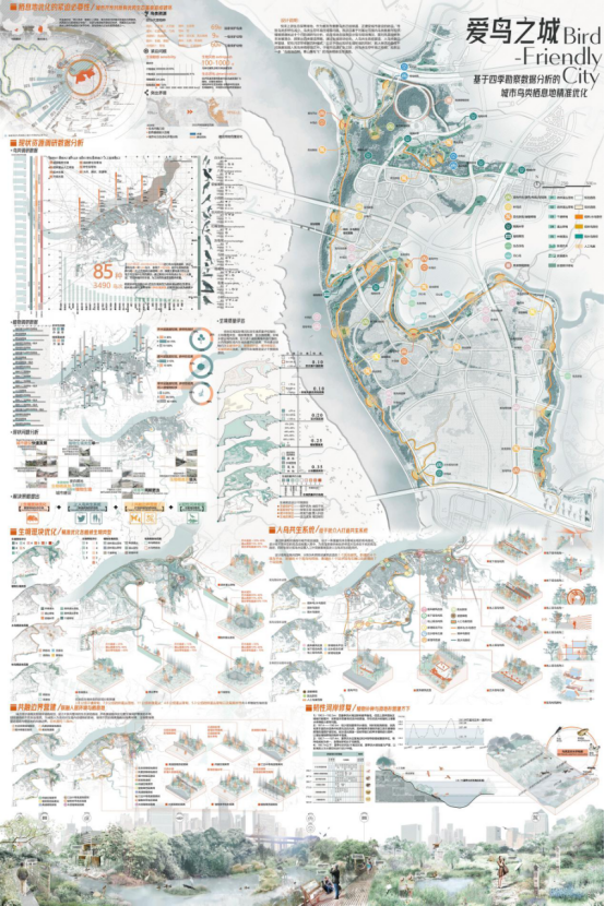 由风景园林系副系主任刘家琳副教授指导的作品《爱鸟之城—基于四季勘察数据分析的城市鸟类栖息地精准优化》荣获2022中国风景园林学会大学生设计竞赛研究生组一等奖。参赛人员包括:张蕊、阳佩琳、张继升、廖中棠、刘宇等5位学生。作品以重庆悦来上游生态保护地为例,在快速城市化背景下规划抢救出鸟类栖息地生存廊道。