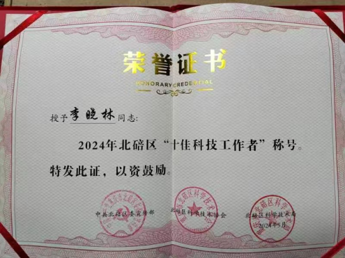 近日,中共北碚区委宣传部、北碚区科学技术协会、北碚区科学技术局评选了2024年北碚区“十佳科技工作者”,学院退休教师李晓林受到表彰。