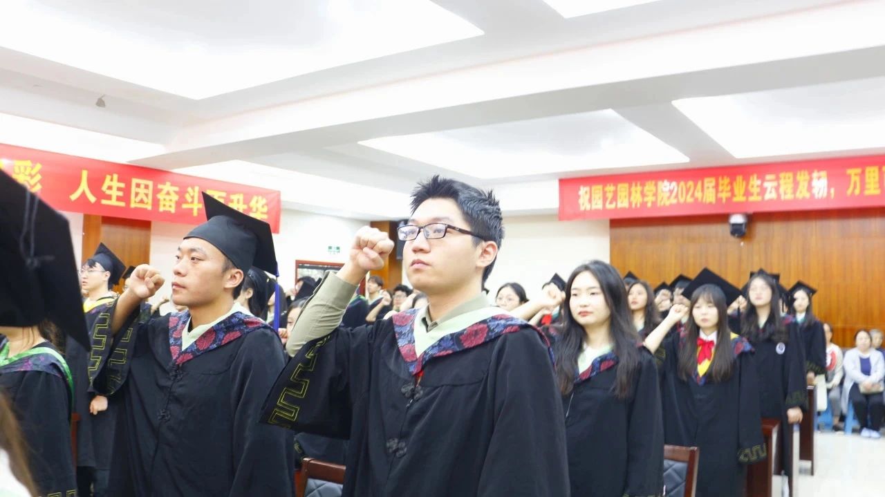 校优秀毕业生代表、2024届园林1班茶志梅代表全体毕业生发言。她分享了自己充实向上的大学生活,向母校、老师和同学表达感谢,向刘佩瑛教授、吴明珠院士等学院优秀校友们表达了崇高的敬意。她呼吁每一位毕业生,肩负起时代的重任,继承并发扬前辈们的优良传统,在中国式现代化的壮丽征程中,用青春的热情和力量,书写属于我们的辉煌篇章。