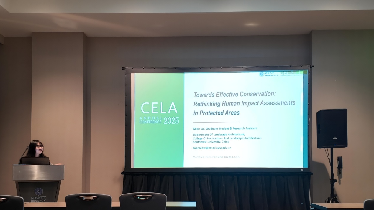 西南大学园艺园林学院杜文武教授指导的硕士研究生兼研究助理眭淼受邀参会并在研究方法分会场(Research Methods Track)题为“Towards Effective Conservation: Rethinking Human Impact Assessments in Protected Areas”的主题报告。研究深入探讨了自然保护地及其毗邻区人类活动影响评估方法的重要性与局限性,基于景观空间格局中的梯度模式(Gradient Model)和景观阻力(Landscape Resistance)原理提出了一种适用于自然保护地人类活动影响评估的新方法——人为压力梯度(Human Pressure Gradient)。方法结合了直接的人类活动强度评估和间接的人类活动影响评估途径的优点,弥补了现有方法在揭示人类活动溢出影响、精细化空间异质性方面的不足,能够更精确地捕捉自然保护地中的人为压力风险,为自然保护地人类活动管理提供了新思路,获得了与会者的一致好评。