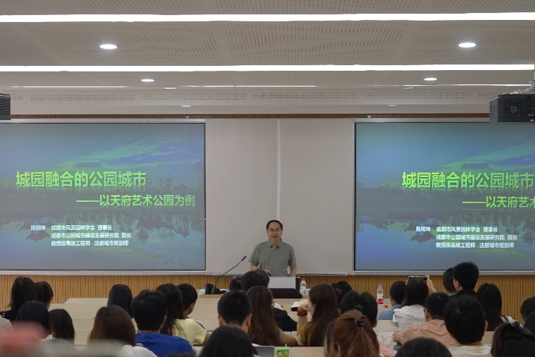 31教学楼208室成功召开。本次大讲堂特别邀请到中国风景园林学会理事长李如生和成都市公园城市建设发展研究院院长陈明坤进行学术讲座。学院党委书记周建华教授主持本次会议,风景园林系主任杜文武教授及百余名风景园林等相关专业师生聆听了讲座。