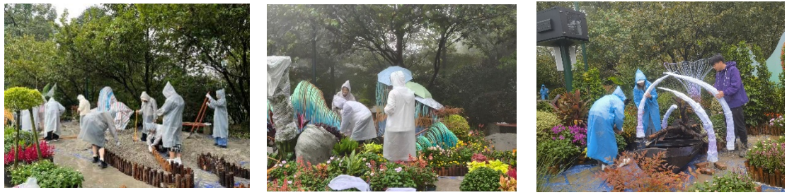 本次大赛现场施工布置阶段为10月17—20日,在为期四天的建造过程中,天气条件较为恶劣,持续降雨给建造带来较大挑战。地面泥泞湿滑,增加了搭建构筑和搬运材料的难度;各组构筑状况频发,从结构搭建的稳固性问题到植物搭配的协调性难题,都考验着同学们的应变能力和专业素养。面对困难,师生团队沉着应对:老师们现场研判问题、优化方案,学生们分工协作、冒雨作业,在保障安全与质量的前提下,高效推进花境作品建造,充分展现了学院师生扎实的专业素养与顽强的奋斗精神。