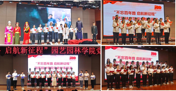 党史故事展演环节包括“学史崇德守初心”、“赓续精神葆本色”、“坚定信仰担使命”三个篇章。学院15个党支部通过故事讲述、诗文朗诵、歌曲演唱、情景短剧等形式,向演绎了党的故事、革命的故事、英雄的故事。其中首批重庆市样板党支部研究生第三党支部带来支部成员原创歌曲《园梦》,以饱满的精神风貌和嘹亮的歌声传承红色基因,表达艺林学子奔赴时代前沿的热血情怀。本科生风景园林第二党支部生动演绎了《红船初心》,研究生第二党支部深情讲述了《遵义长征路上的守护者——红军“菩萨”的故事》,本科生风景园林党支部第一党支部通过少数民族学生与时代榜样隔空对话的表演形式许下了青年学生党员的铮铮誓言,研究生第六党支部伴乐朗诵了《一百年华》。其他学生党支部的表演也精彩纷呈,可圈可点。会上,首次展演了学院教工党员合唱曲目《唱支新歌给党听》的比赛视频。