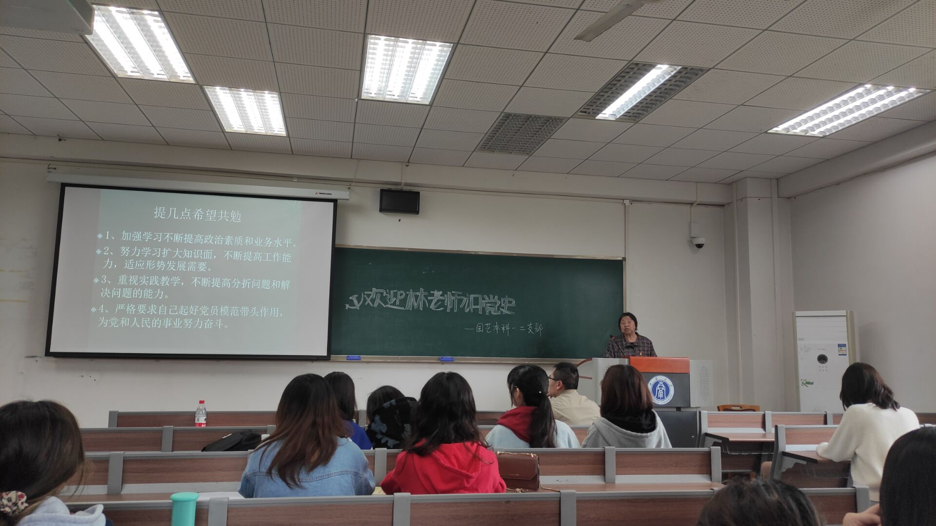会上,林德清教授以自己毕生的学习、生活和工作经验为背景,结合中国共产党不同时期的方针和领导,分享了自己的求学、教学生涯。从小树立了农业志向的她,成绩一路拔尖,最终考入西南农学院,并在毕业后留校任教。在校蔬菜教研室从事蔬菜栽培技术教学和推广的38年间,林老教授始终跟随着共产党的脚步,始终以党员标准严格要求自己。1984年入党以后,林德清先生更是学在深处,干在实处;2000年后,林教授退而不休,情系三农,深入农村,将农业知识传播到了石柱、广安、巫山等25个区县,帮助农民们脱贫致富,至今仍奔跑在扶贫攻坚一线,其几十年如一日的坚守深深打动了在座党员。最后,林德清教授向支部内党员们提出几点希冀——一是提高政治素养;二是增强专业水平;三是重视实践劳动;四是引领党员模范。