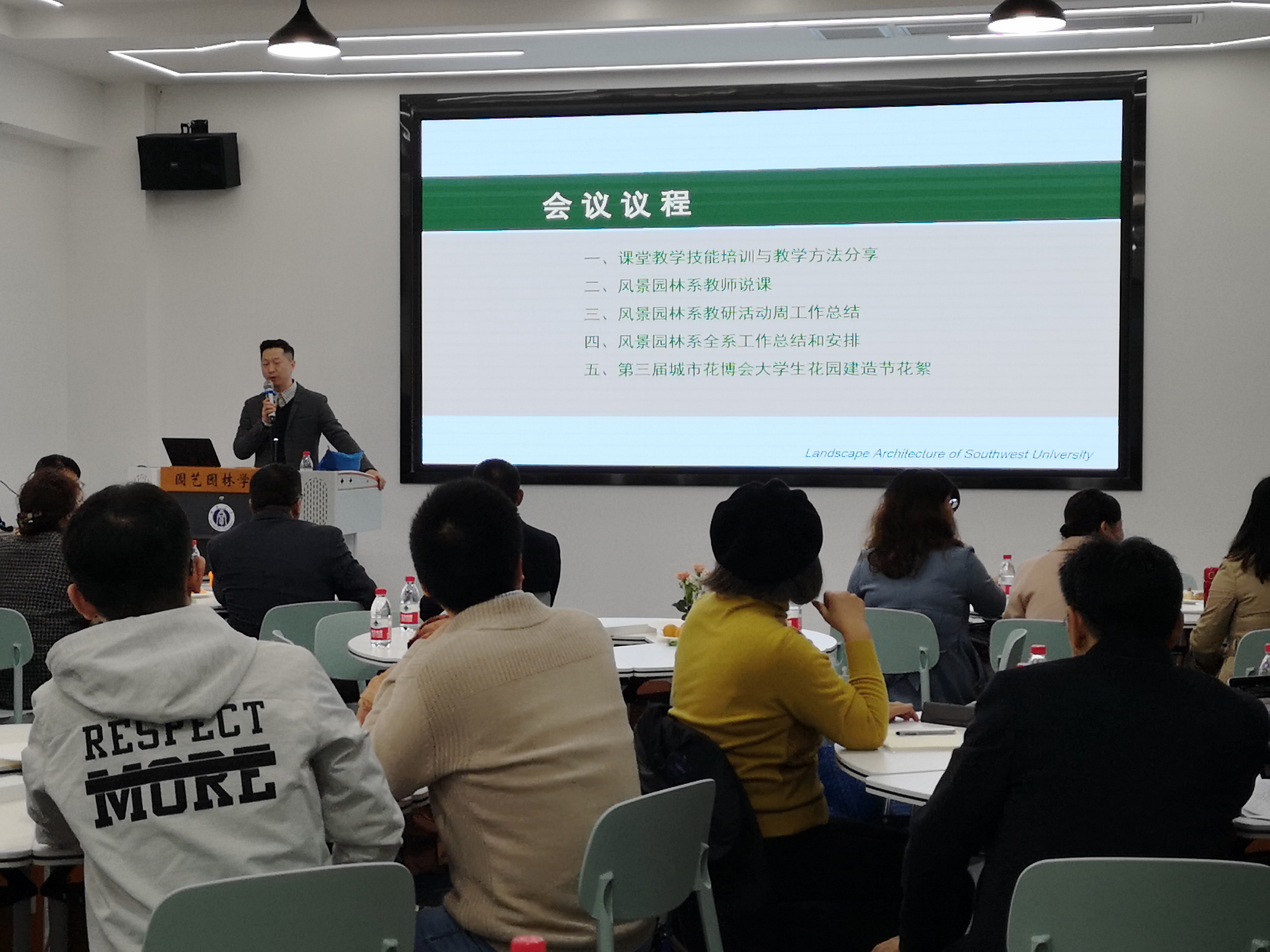 活动共分五个环节:“课堂教学技能培训与教学方法分享”、“教师说课”,“风景园林系教研活动周工作总结”、“系工作总结和安排”、“大学生花园建造节实践与花园杯设计竞赛分享”。