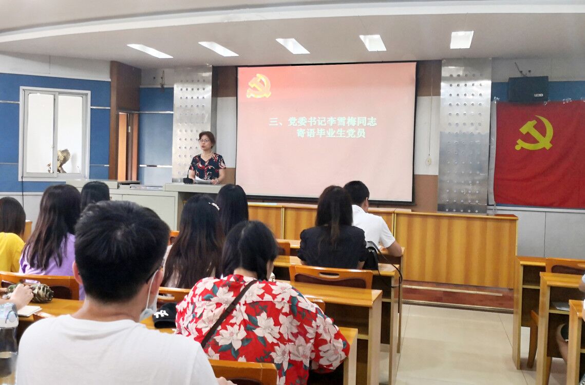 大会在庄严的国歌声中拉开帷幕。郑书记带领全体2020届毕业生党员重温了入党誓词,进一步坚定了理想信念。随后,党委书记李雪梅同志寄语毕业生党员,她希望毕业生党员能坚定信念,不忘初心,踏实肯干,勤奋钻研,严于律己,做好表率,时刻牢记共产党员的担当与使命,用时间不断锤炼自己。