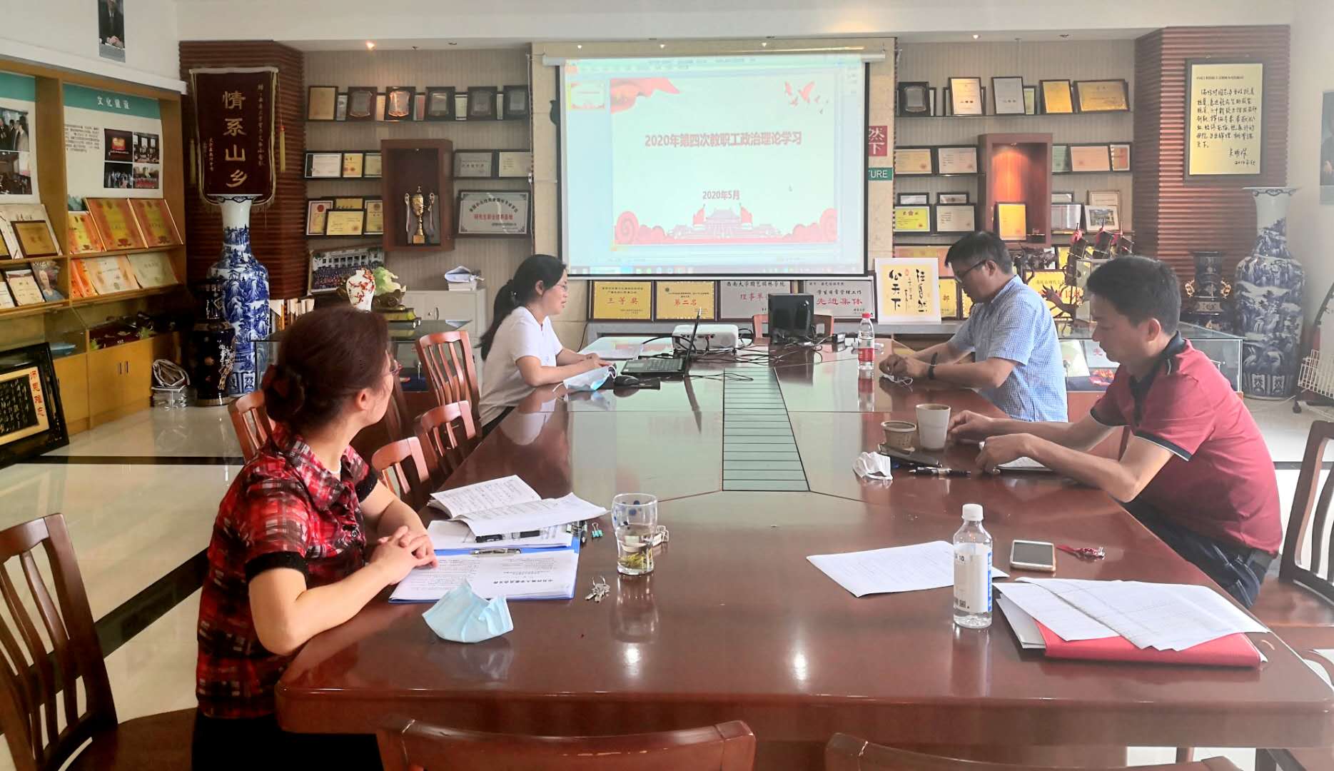 5月8日下午,学院领导集中在33教411会议室,老师们通过QQ分享屏,线上与线下相结合的方式,学院组织开展了5月教职工政治理论学习会。会议由党委书记李雪梅主持。