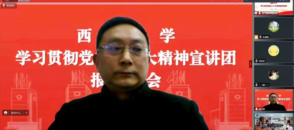 教职工开展宣讲。董乃斌处长围绕党的二十大主题及主要成果,过去5年工作和新时代十年的伟大变革,马克思主义中国化时代化,中国式现代化,全面建设社会主义现代化国家的目标任务,坚持党的全面领导和全面从严治党,应对风险挑战等七个方面,结合其学科专业和工作实际,对党的二十大精神作了系统宣讲和重点解读。