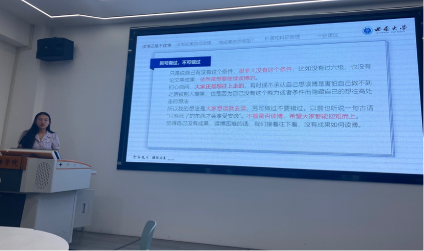 第三部分,经验分享。支部邀请毕业生党员郭效诚同志和杜文婷同志,就支部党员关心的研究生就业和科研两方面做了分享交流。郭效诚指出考虑就业时要注意要明确定位、合理匹配,将自己的特长与用人单位所需进行匹配,对标目标单位,有针对性的提升自身素养。杜文婷向支部党员分享了自己的申博历程,结合身边的事例给大家提出了申博建议。