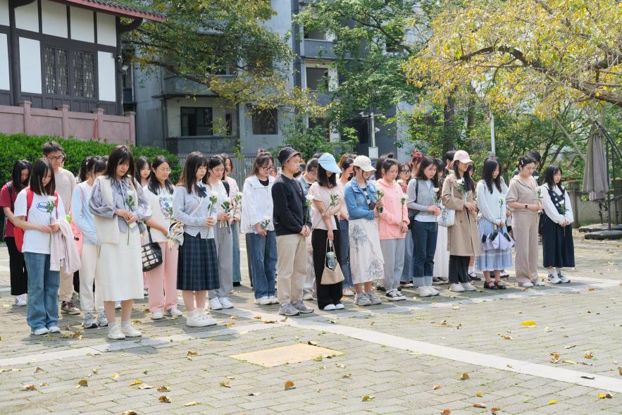 在研究生第二党支部书记金云鹤的带领下,全体党员在卢作孚两兄弟雕像前敬献鲜花并默哀,沉重的缅怀了这位”中国船王”。