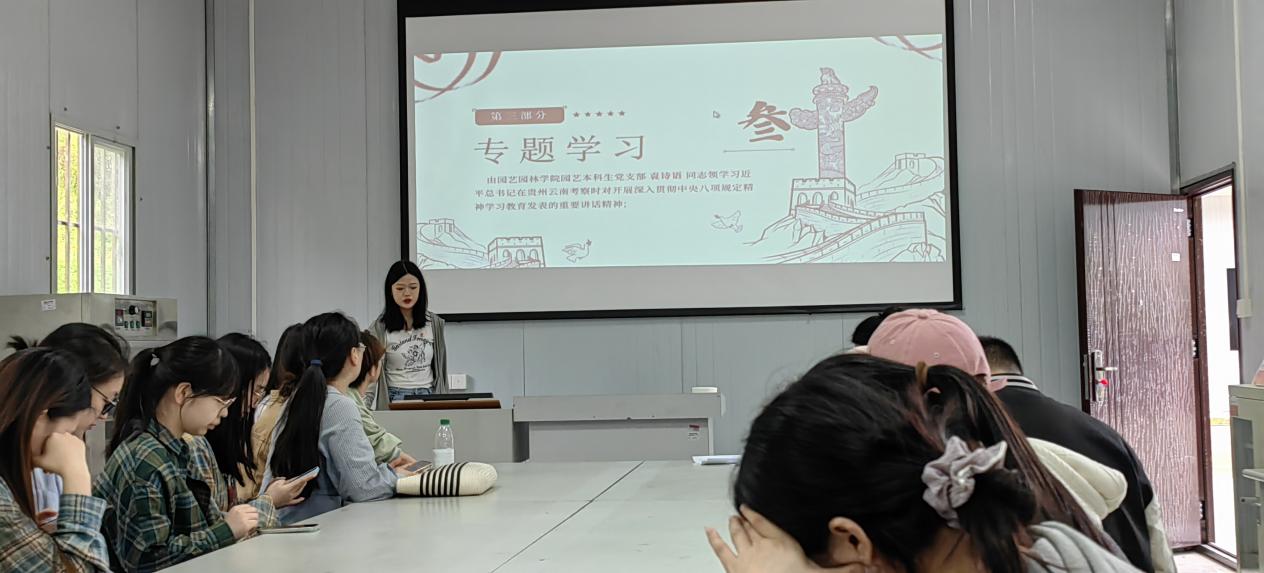 在集中学习环节,马克思主义学院硕士生第二党支部刘柳同志以“重温《共产党宣言》 砥砺初心使命”为主题,带领全体党员研读马克思主义经典著作。她从“两个必然”的历史规律、共产党的历史使命等核心观点出发,结合新时代伟大变革,深刻阐释了《共产党宣言》的当代价值。学院园艺本科生党支部袁诗语领学习近平总书记在贵州和云南考察时的重要讲话精神,赵茂伶领学习近平总书记关于加强党的作风建设的重要论述和中央八项规定及其实施细则精神。
