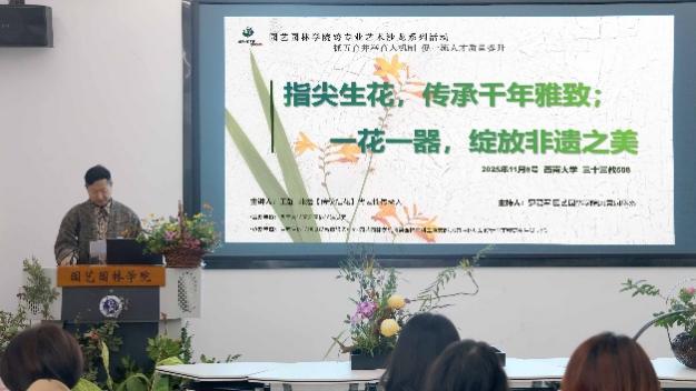 为深入贯彻“五育并举”育人理念,全面提升学生综合素养与审美能力,11月8日下午,由学院党委主办的“园行领航跨专业艺术沙龙”第三场顺利举行。本次活动以“指尖生花,传承千年雅致;一花一器,绽放非遗之美”为主题,聚焦国家级非物质文化遗产——中国传统插花艺术,由风景园林本科生党支部牵头策划,学院党员教育服务中心、风景园林本科生党支部及风景园林规划设计与工程研究生党支部联合承办。
