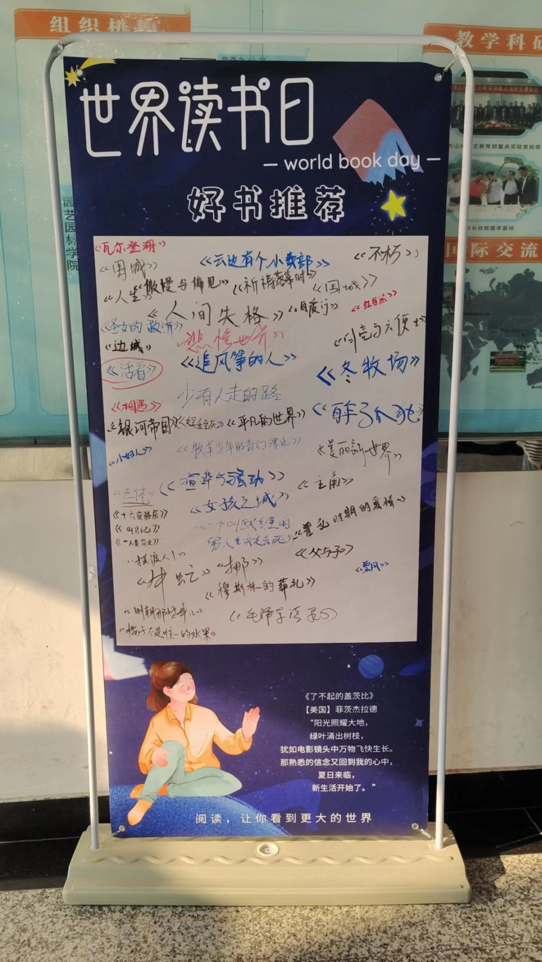 不知道什么书值得一看,那就来好书推荐墙。同学们将自己读过的好书书名留在墙上,推荐给其他同学,促进好书推广。同时,来往同学看到自己喜欢的书也被喜欢着,纷纷表示产生了一种特别的共鸣。