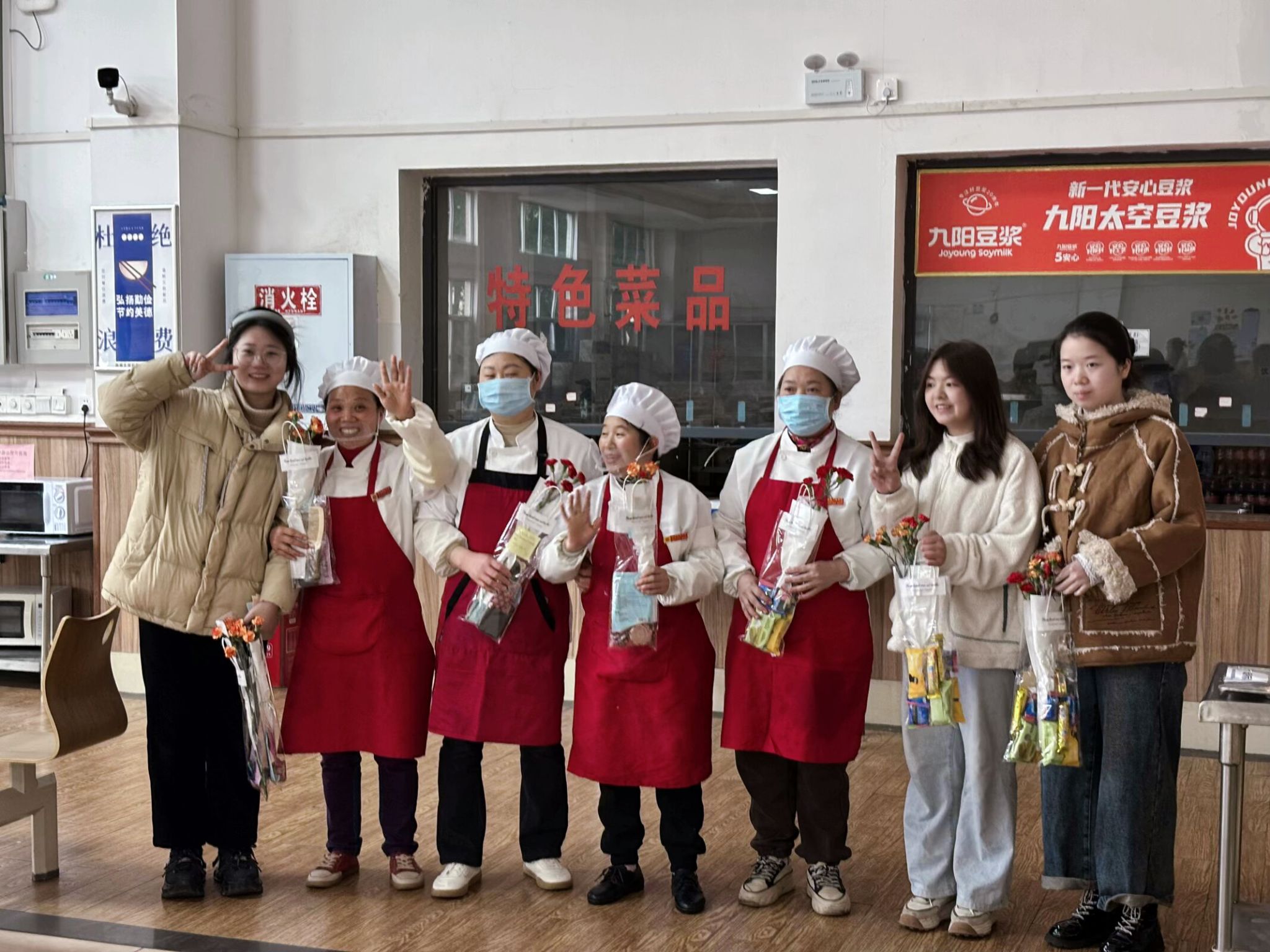 随后,同学们分组前往食堂、宿舍、教学办公楼和共青团花园,开启了一场温馨的花之旅”。在食堂后厨,同学们将精心准备的鲜花和小礼物递到正在忙碌的阿姨们手中。一位阿姨停下手中的工作,轻轻擦拭着双手,小心翼翼地接过鲜花和礼物。她的眼眶微微泛红,声音中带着感动“没想到孩子们这么用心,这份礼物让我觉得所有的辛苦都值得了!”