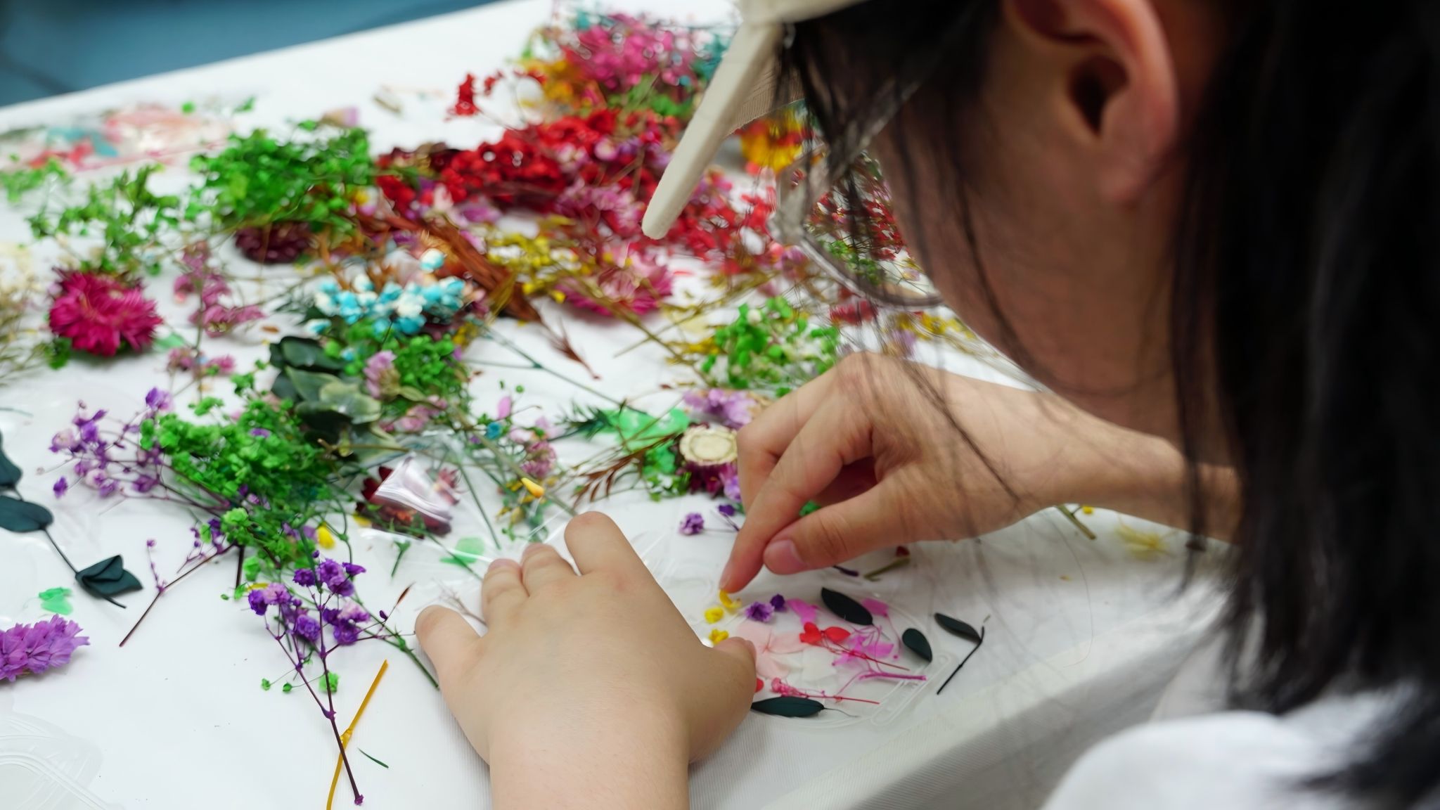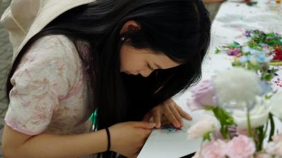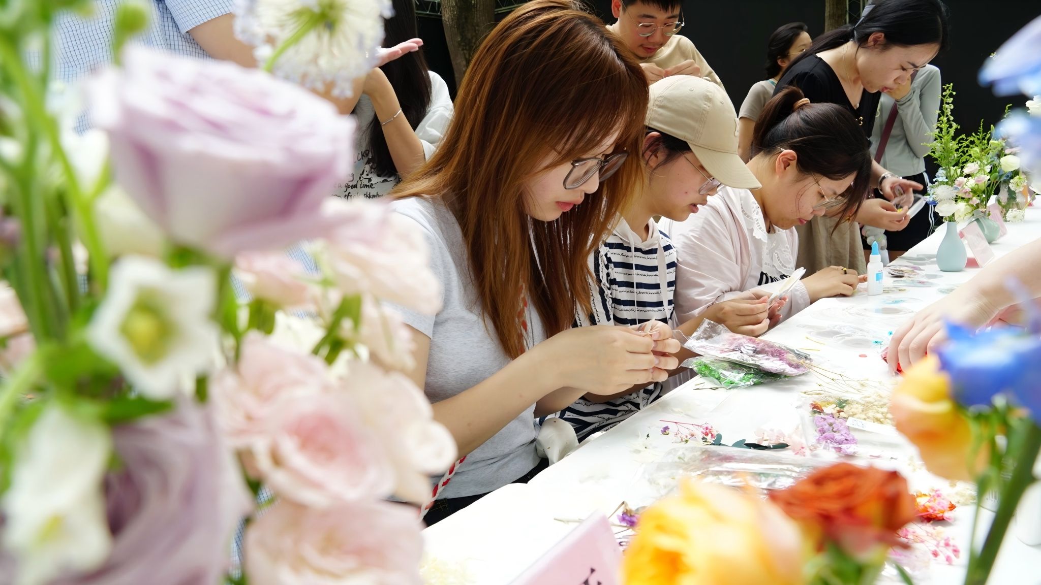 在“花间雅集”区域,插花压花活动有序开展。参与者们围绕鲜花与植物材料,精心构思。插花者在工作人员指导下,挑选搭配花材,专注于每一个细节,将自然之美浓缩于瓶中;压花体验区提供干花材料与压花教学,参与者将花瓣、叶片制成书签或装饰画,感受植物艺术的永恒魅力。