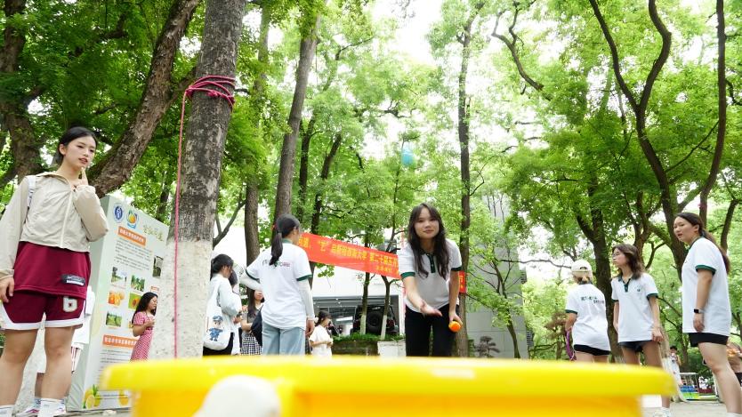 “晕头蝇向”的游戏让现场气氛高涨。参与者旋转后虽脚步略显踉跄,但仍眼神坚定地瞄准目标桶,努力投掷弹力球。成功投中的欢呼与失败后的加油声此起彼伏,大家在趣味挑战中释放活力,感受花卉果蔬的魅力。