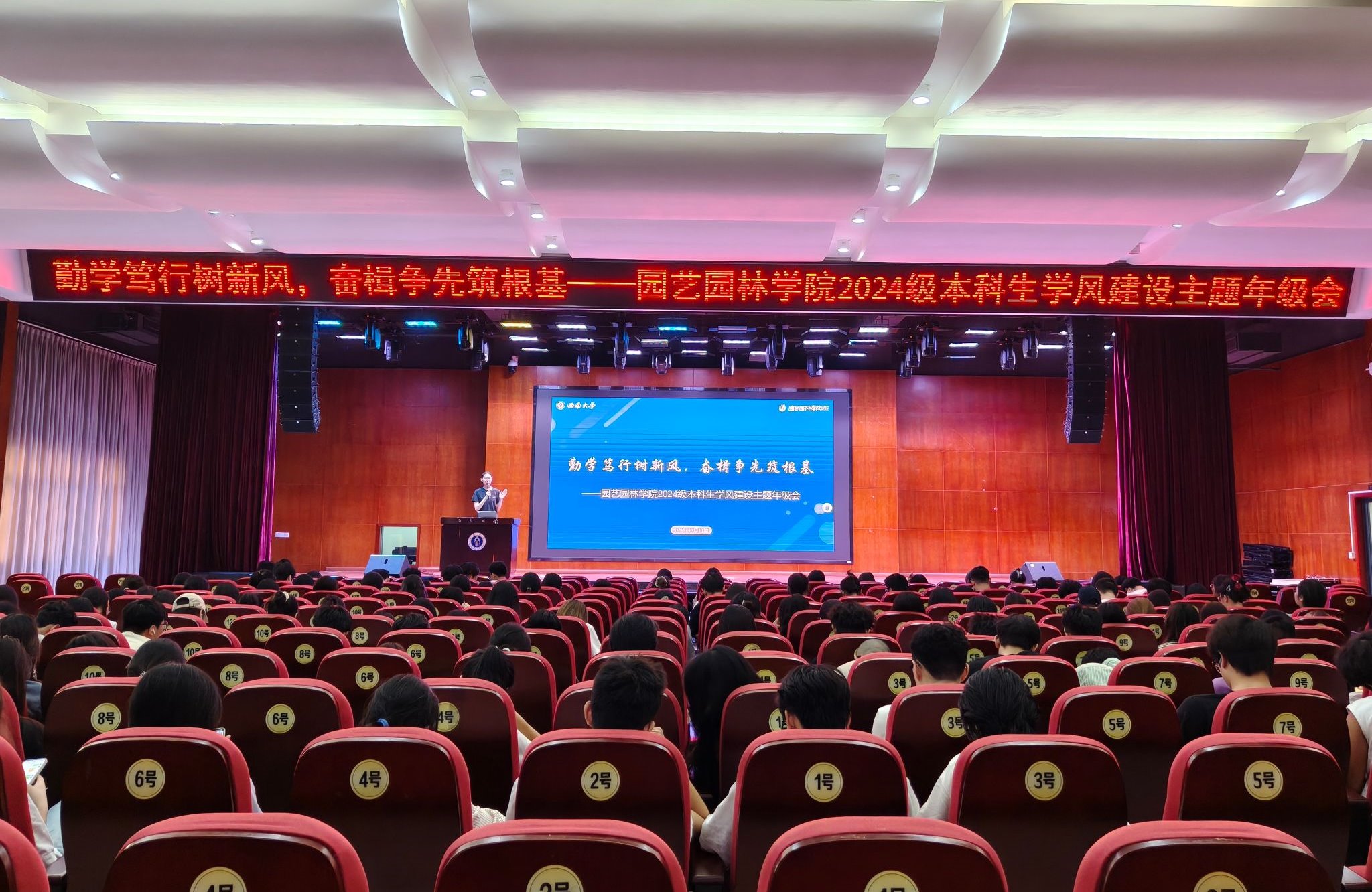 为落实立德树人根本任务、深化“三全育人”成效、筑牢校园安全防线,10月10日下午,学院在南区学生活动中心107报告厅召开2024级本科生学风建设主题年级会。年级会由2024级本科生辅导员许淑雅主持,旨在激发学院学生的学习主体意识,增强学生在学风建设中的主动性、自觉性和创造性,为大学生成长成才提供精准导航。