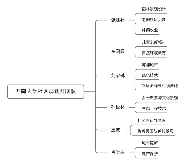 社区规划师团队具有高级职称4名、博士4名、硕士生导师3名、国家注册城市规划师1名、重庆市一级风景园林师1名、重庆市园林工程师1名。该团队将以专业的技术经验、深厚的学术积淀、无私的服务热情投入社区规划公益工作中,为重庆市社区更新发展贡献专业力量。
