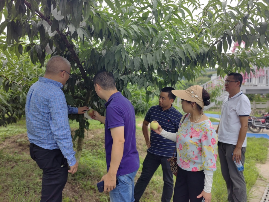特派员们对园区桃树生长、土肥管理、病虫防治等进行了实地指导和技术服务,建议不使用除草剂、膨大剂等化学药剂,通过以草制草的方式来驱除杂草,并使用灭虫灯、诱虫板、果实套袋等方式提前预防桃园的病虫害。通过交流,双方也希望进一步探索院企合作新模式。
