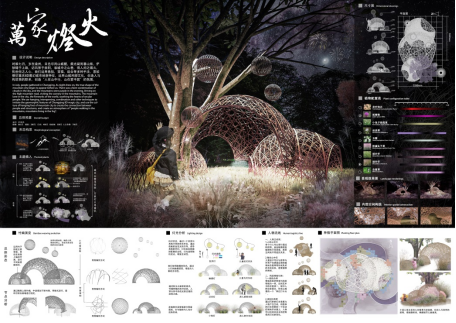设计理念:《华阳国志·巴志》中结舫水居五百余家一言道出重庆深厚的码头文化,江滩樯桅如林、船蓬相连,处处可见渔民捕鱼之景。本设计以渔樵江渚为主题,以重庆码头文化为切入点,挖掘承载其深厚历史文化的要素江水渔网船篙,抽象三要素形态,通过构筑和植物营造泛舟览江银鳞雀跃结网归舟的场景序列,形成舒缓、跳跃、明快的节奏变化,艺术化展现老重庆码头捕鱼的生活场景,并结合夜晚灯光设计,营造字水霄灯的景象,带领观者浸入古老重庆江滩的浩浩江水,重忆往昔。