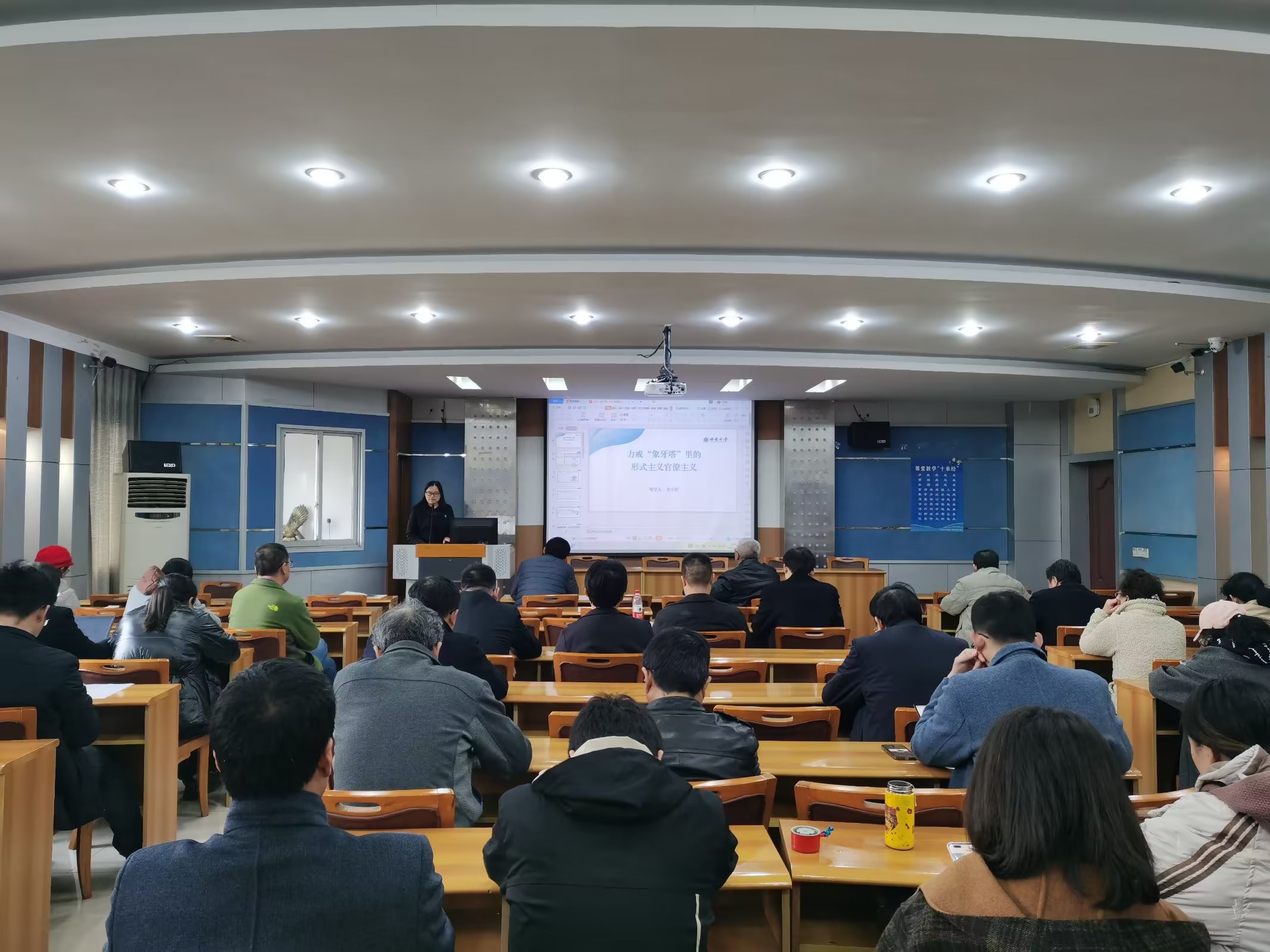 李小红同志从如何认识形式主义、官僚主义切入,全面分析当前主要表现,结合校园里的官僚主义,从 “官气十足,衙门做派”“门户林立,近亲繁殖”“不务正业,攀附结交”“好高骛远,贪图虚名”四个方面,带领参会人员分析了“象牙塔”里的官僚主义的常见现象及其危害。