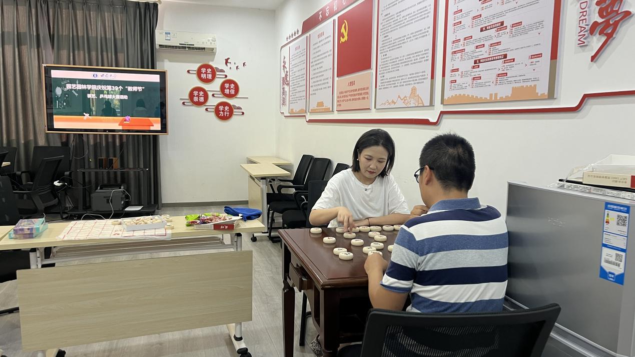 象棋活动现场激烈精彩,紧张有序,参赛棋手排兵布阵,调兵遣将,跃马扬鞭,驱車直行,棋盘形势瞬息万变,你进我退,你攻我守,时而举棋不定,时而落棋有声,一次又一次的精彩角逐,体现了教职工的智慧和魅力。
