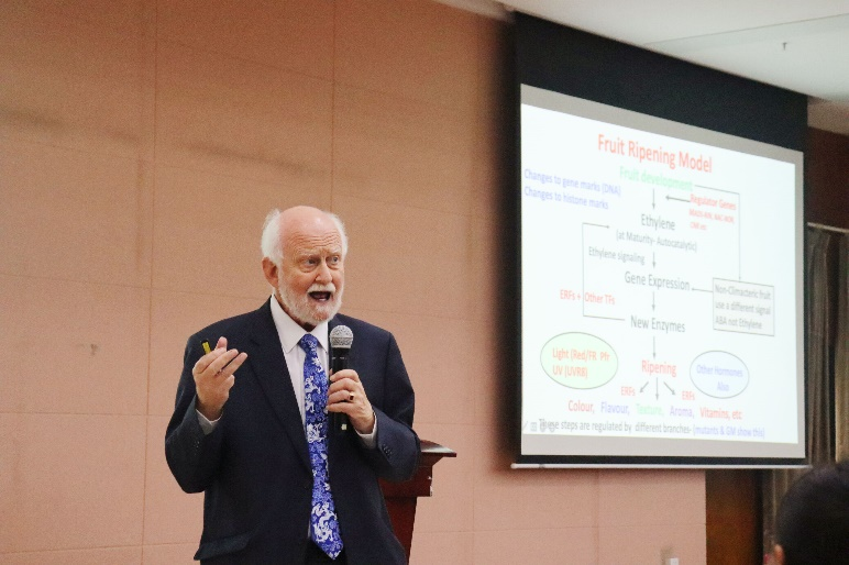 邀请英国皇家科学院院士、英国诺丁汉大学植物科学系名誉教授、中国工程院外籍院士、浙江大学光彪教授、国际知名果实品质生物学专家Dr.Don Grierson,于隆平楼204开展了以The Regulatory Networks Controlling Composition and Quality of Ripening Fruits为主题的学术报告,约200位师生参与本次讲座。