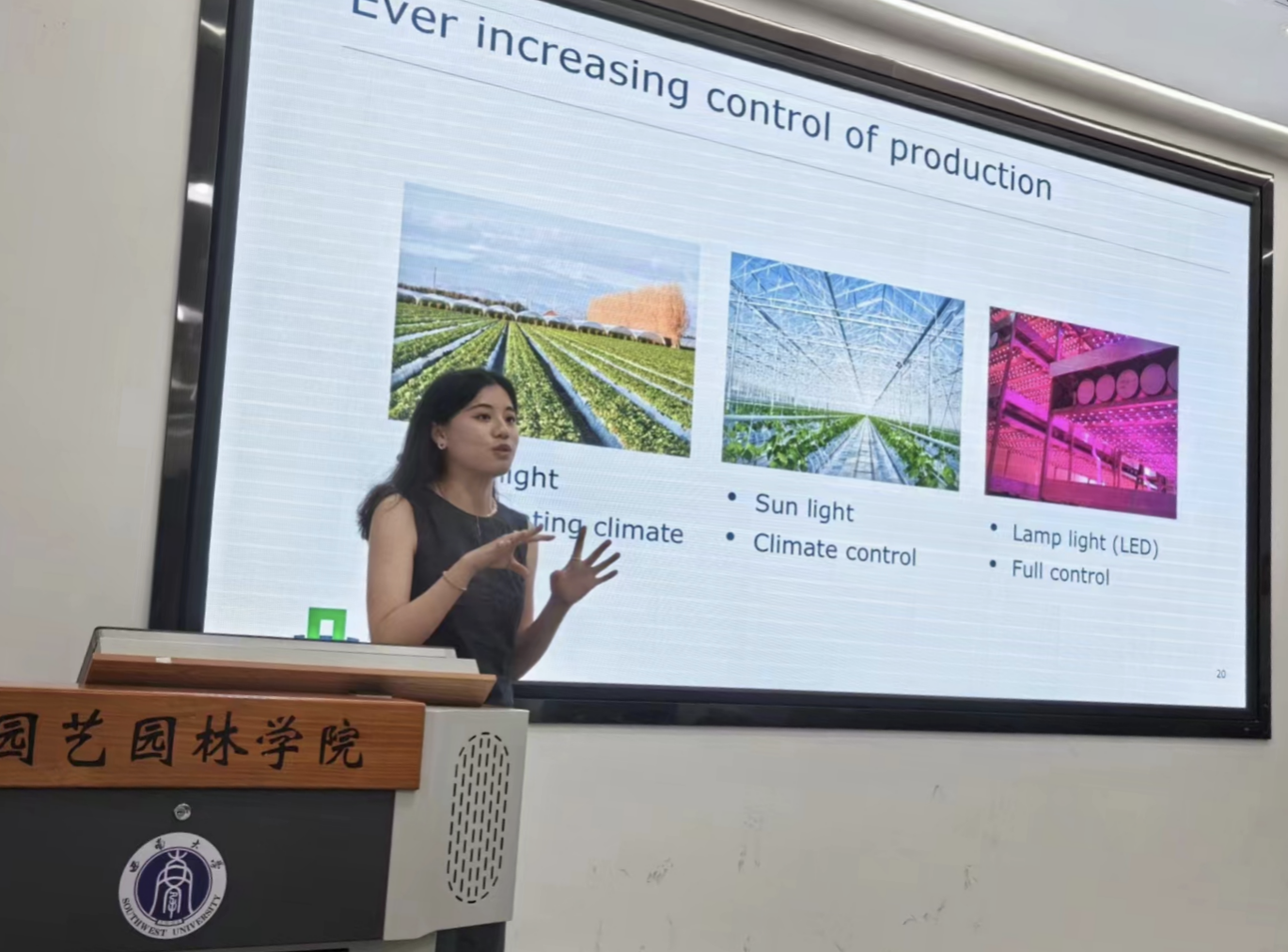 赖雪萌校友以《欧洲垂直农场,植物科学研究以及大学系统》为题,阐述了垂直农业在欧洲学术研究以及市场生产的现状与未来展望,展示了可控环境农业光调控前沿研究成果。此外,赖雪萌还分享了她对荷兰研究大学系统的理解和在欧洲的学术经历和工作生活。在交流讨论环节,赖雪萌和与会师生就垂直农业的应用前景、本科生专业课学习与英语能力提升的平衡、留学申请等问题进行了深入交流。赖雪萌的精彩分享使与会人员受益颇多,赢得了参会师生的阵阵掌声。